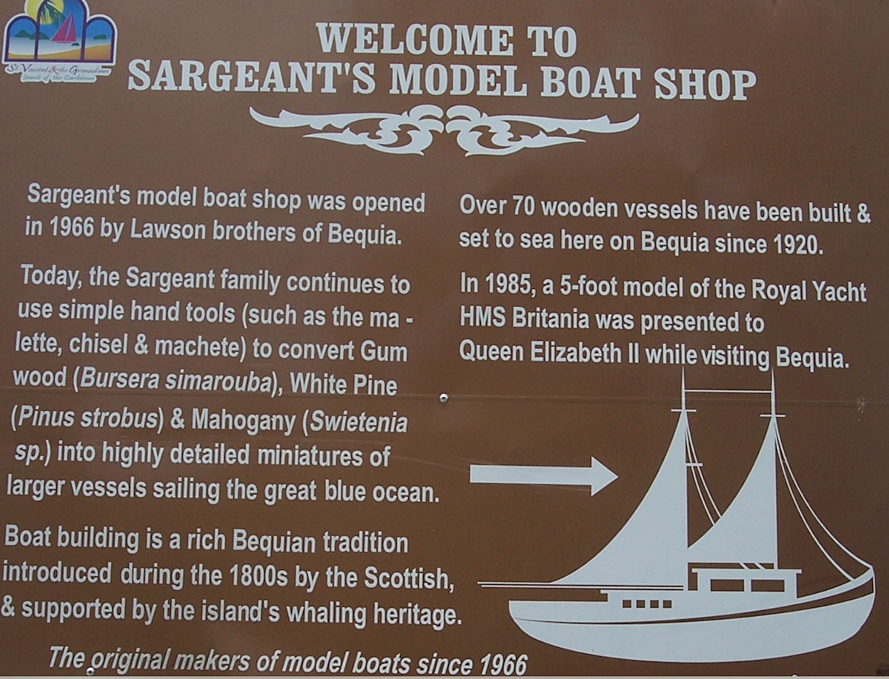 Over 70 wooden vessels were built and launched in Bequia in 1920s. Its been a tradition introduced by the Scottish in the 1800s. The boats were vital to the whaling industry. Using simple hand tools the Sargent family now makes miniature models of the ancient ships using White Pine, Mahogany, and Gum wood.